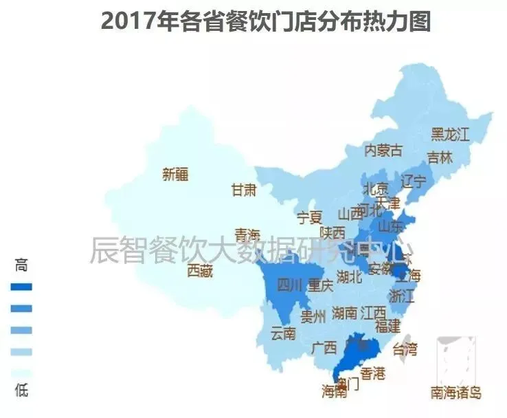 2017年,餐饮门店的分布相对集中在东南沿海区域。