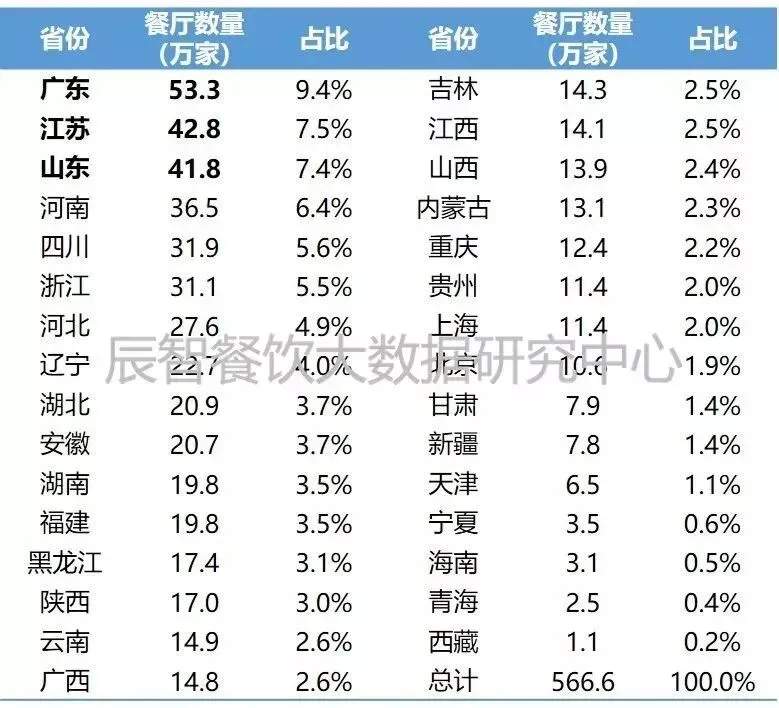 TOP3省份为广东、江苏和山东,餐厅数量均超过40万家。