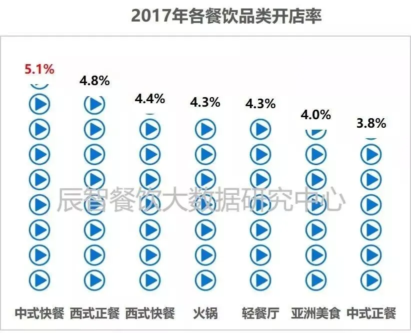 辰智科技商业魅力评价模型显示:2017年各餐饮品类开店率中,中式快餐最高,中式正餐最低。