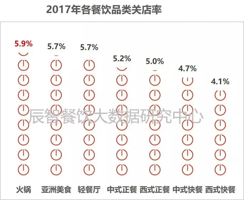 而2017年各餐饮品类关店率中,火锅最高,西式快餐最低。