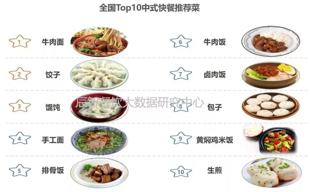 中式快餐top10推荐菜分别是:牛肉面、饺子、馄饨、手工面、排骨饭、牛肉饭、卤肉饭、包子、黄焖鸡米饭、生煎。