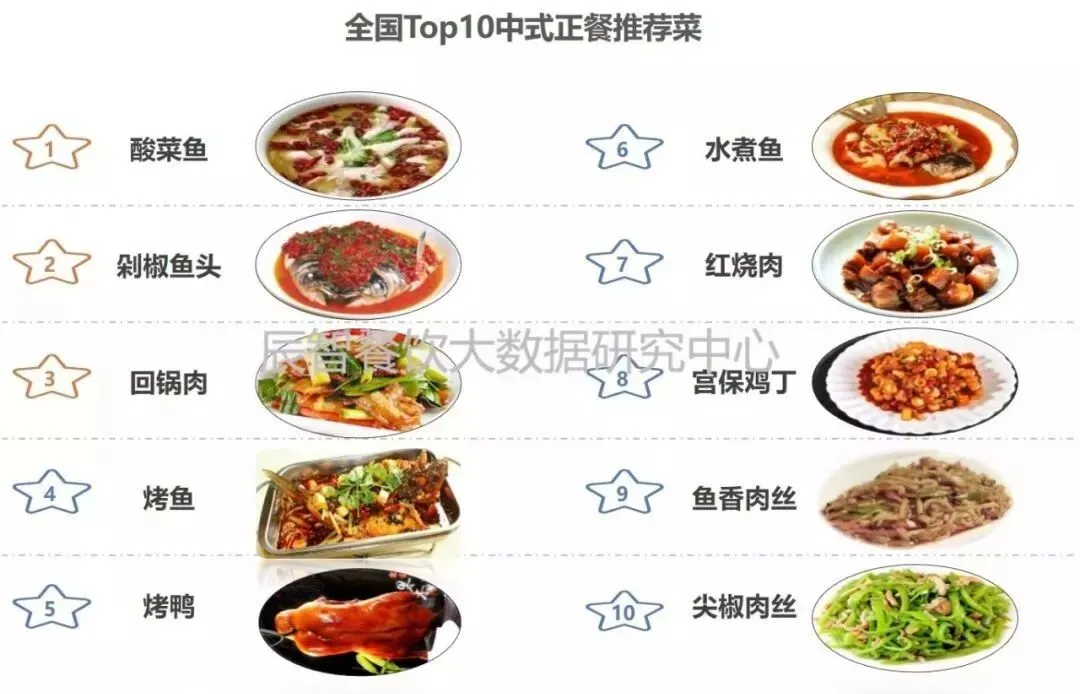 中式正餐top10推荐菜分别是:酸菜鱼、剁椒鱼头、回锅肉、烤鱼、烤鸭、水煮鱼、红烧肉、宫保鸡丁、鱼香肉丝、尖椒肉丝。