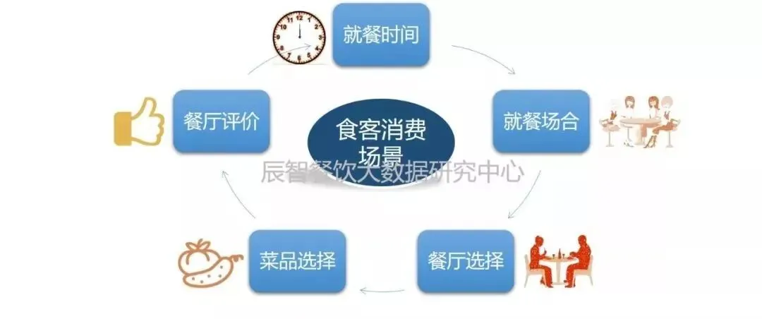 为了能够顺畅的解读本次研究成果,我们将食客的消费行为及相关因素和指标进行研究与重构,完成食客消费场景的呈现,这些消费场景主要包括就餐时间、就餐场合、餐厅选择、菜品选择、餐厅评价。
