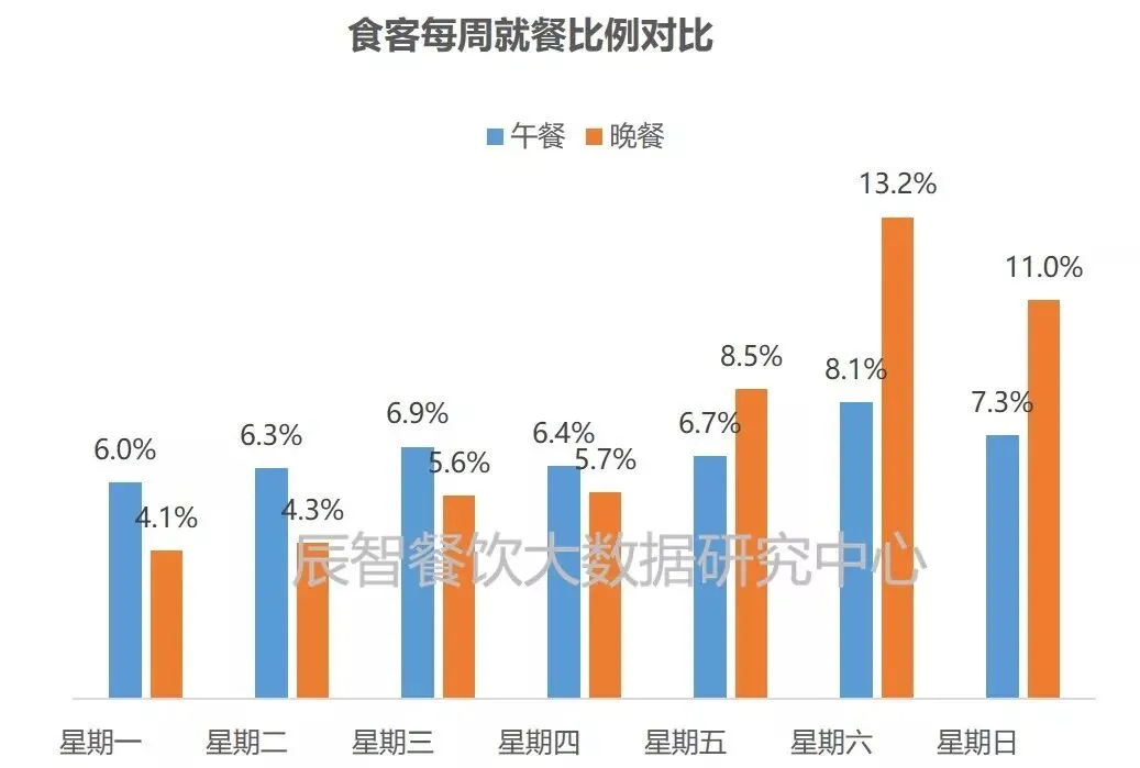 从一周就餐时间变化来看,周一到周六就餐基本成上升趋势,周六达到高峰。