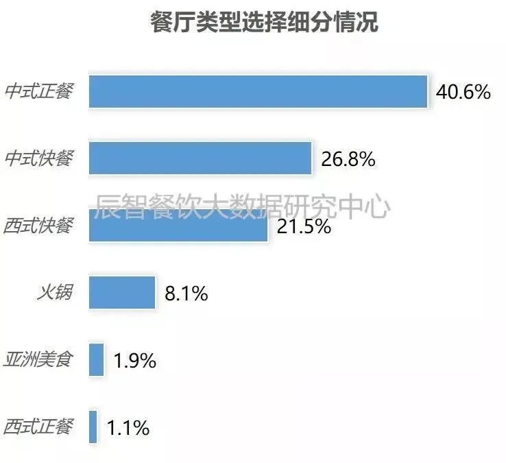 中式正餐、中式快餐和西式快餐是餐饮食客的主要选择,分别占比为40.6%、26.8%、21.5%。