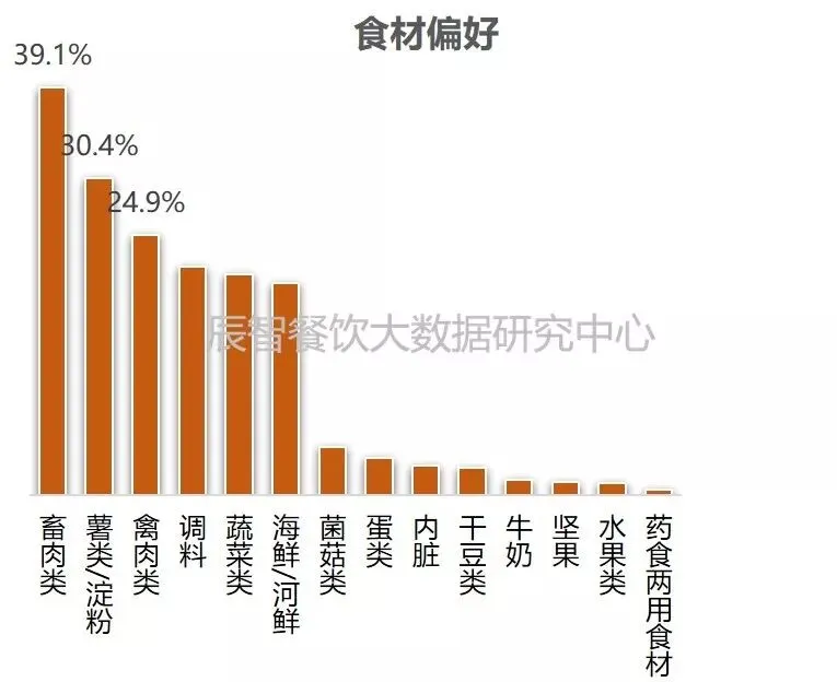 食材方面,食客较为偏好畜肉类、薯类/淀粉类和禽肉类。