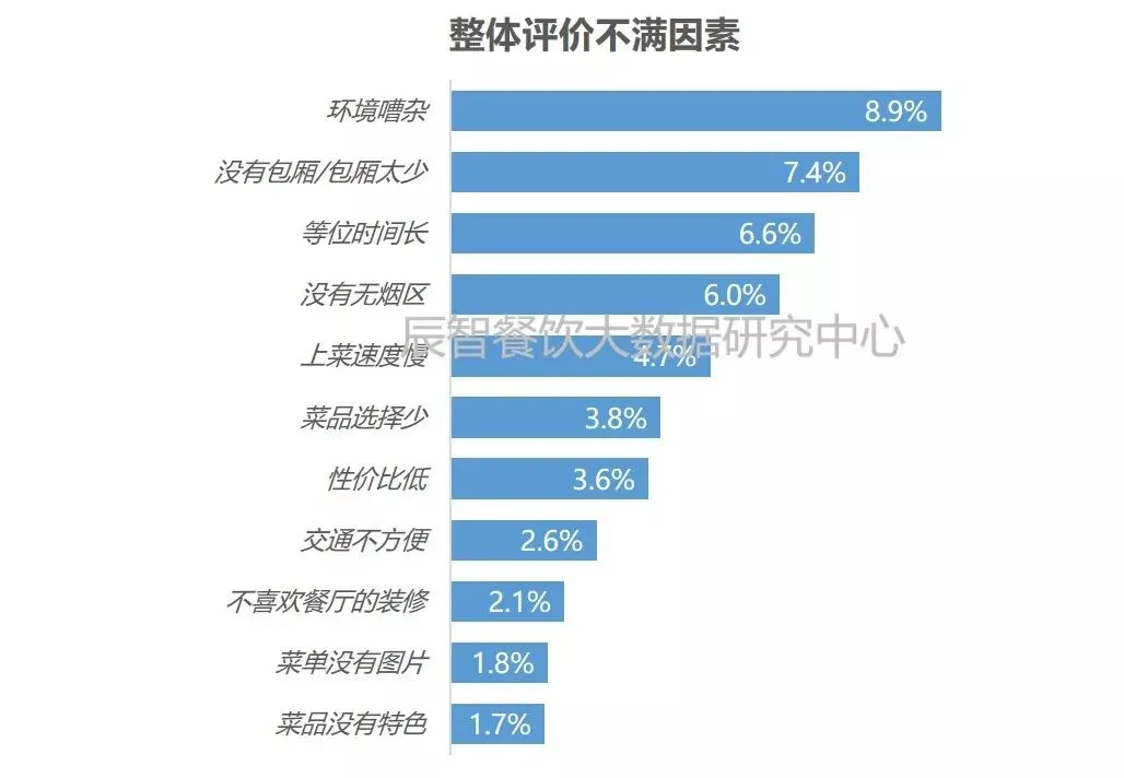 “环境嘈杂”、“没有包厢/包厢太少”和“等位时间长”则是导致食客不满意的前三大因素。