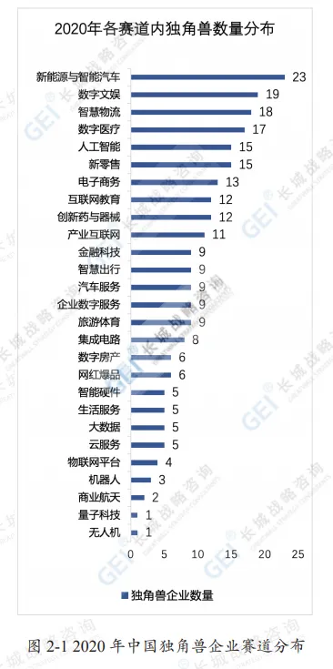 新能源与智能汽车、数字文娱、智慧物流、数字医疗、人工智能、新零售、电子商务、互联网教育、创新药与器械、产业互联网等赛道均拥有10家以上独角兽企业;2020年新出现网红爆品、商业卫星、智能充电、AI制药、半导体材料、知识产权数据服务、数字医助、在线教室、数字健身等9个新赛道。