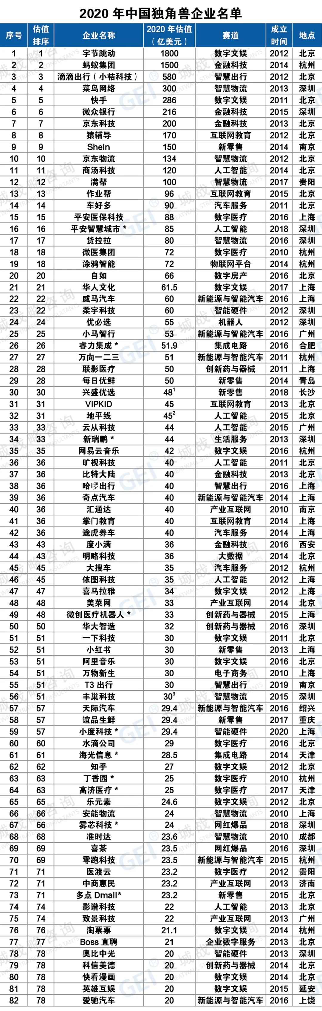 附:中国独角兽榜单2020