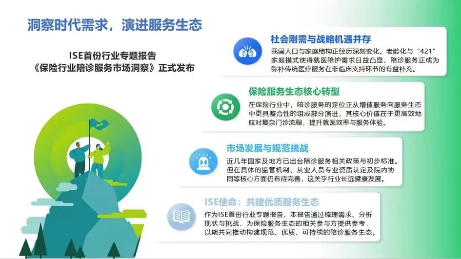 近日,保险服务生态网络(ISE)正式发布了《保险行业陪诊服务市场洞察》专题报告(获取洞察报告全文,请扫描本文底端二维码)。陪诊服务是目前保司“产品+服务”模式中,使用量最为集中的服务之一。作为ISE的首份行业专题报告,该报告聚焦“陪诊服务”这一领域,背后是基于ISE对社会需求、行业演进与生态责任三个层面的深度洞察。