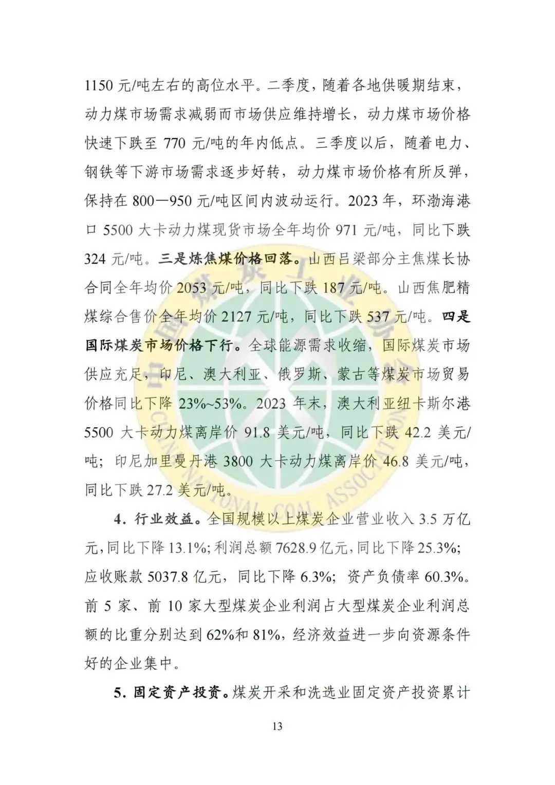 《报告》显示,2023年全国规模以上煤炭企业营收达到3.5万亿元,同比下降13.1%;利润总额达7628.9亿元,同比下跌25.3%。