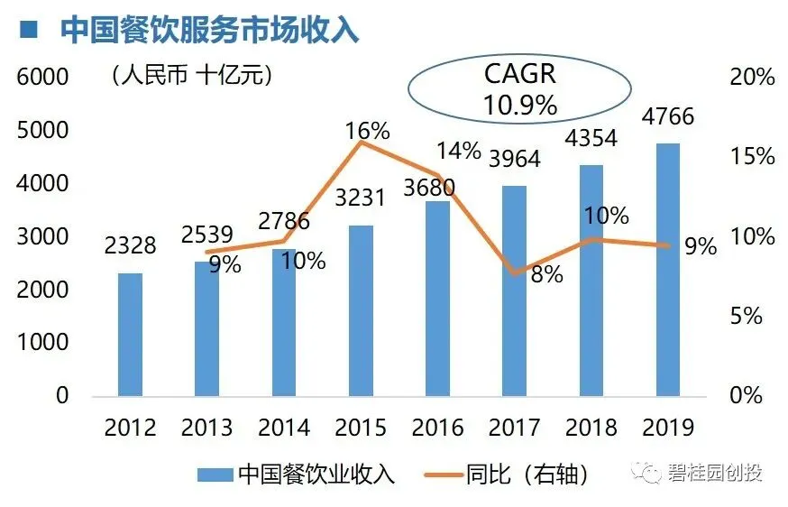中国餐饮市场规模近5万亿,在居民生活水平提升、外出就餐占比提升等多重驱动下,仍处于快速增长的阶段。2014-2019年,中国餐饮服务市场收入从2.8万亿元增长至4.7万亿元,复合年增长率达到10.9%。
