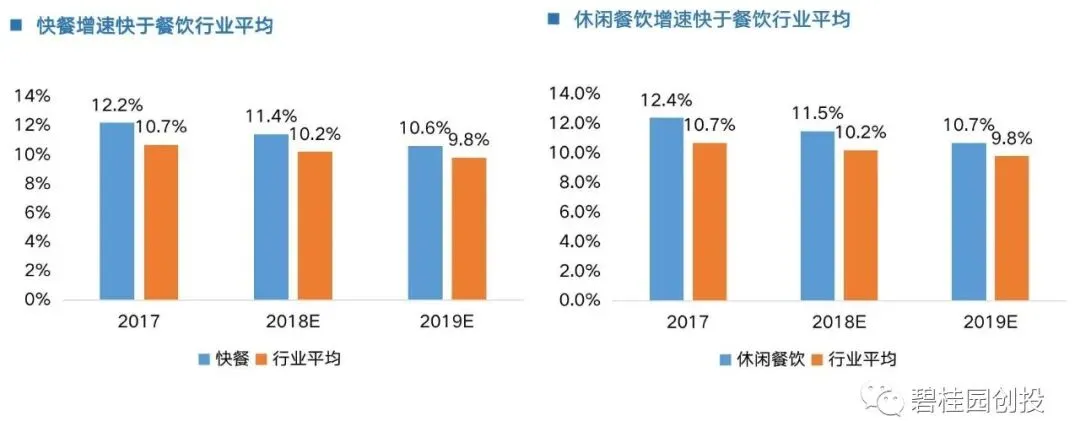 快餐和休闲餐饮的增速均高于餐饮行业平均水平,其中休闲餐饮增长最快。根据弗若斯特沙利文和中金的估算,2017-2019年,快餐的增速比行业平均水平高约0.8%-1.5%,休闲餐饮的增速比行业平均水平高约0.9%-1.7%。