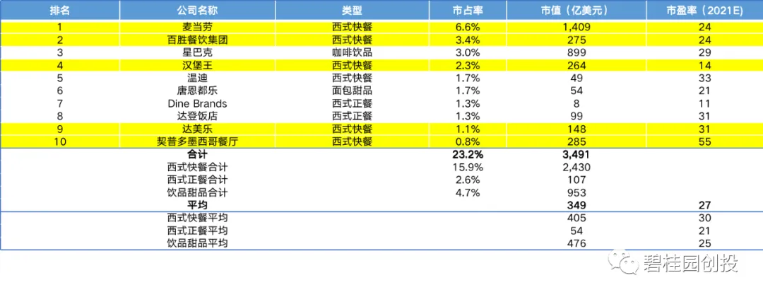 快餐业态市值更高。截至2020年6月15日,美国餐饮上市公司TOP10的市值合计3,491亿美元,其中快餐达2,430亿美元,占比70%,其平均市值也远高于正餐。