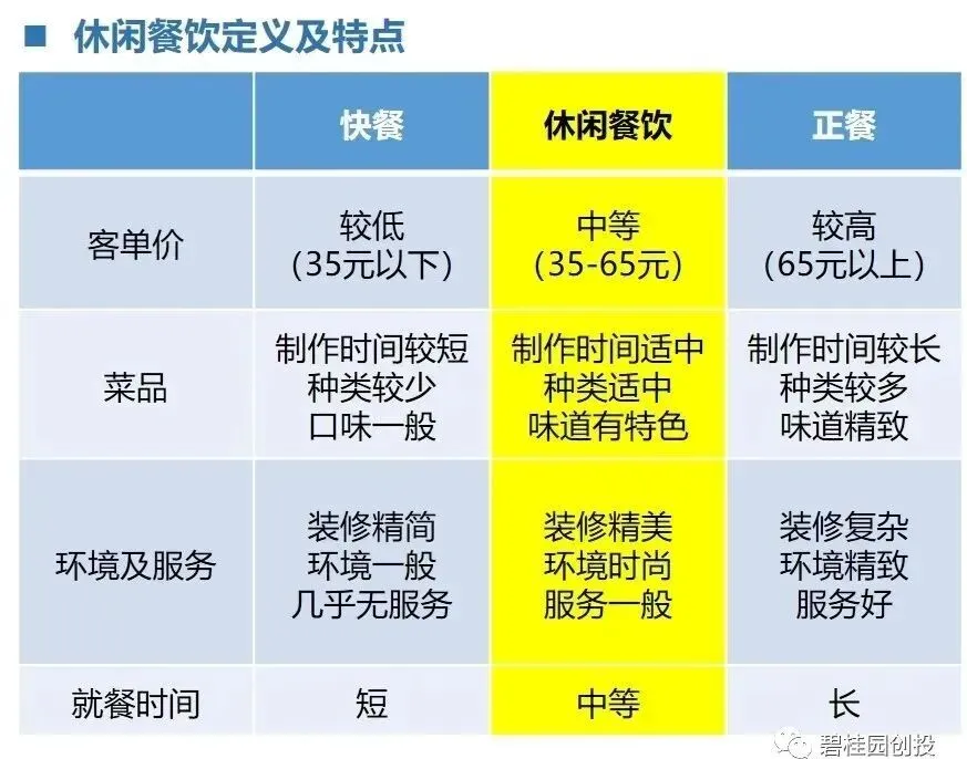 休闲餐饮:介于正餐和快餐之间的一种餐饮形式。一般具有价格适中、就餐时间适中、菜品有特色且较为精致、环境时尚惬意、有文化因素融入等特性。