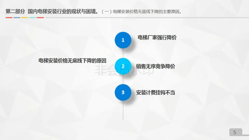 2.销售无序竞争降价:部分厂家销售价格无底线,电梯销售代理权限过大,为争取电梯订单,代理再次降低安装价格,价格形成双降。