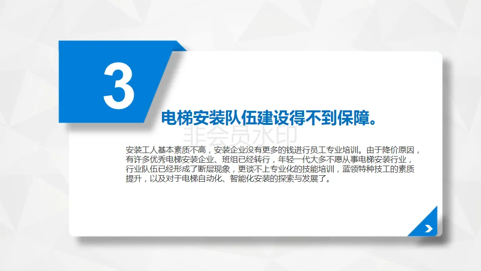 安装工人基本专业素质不高,安装企业没有更多的钱进行员工专业培训。由于降价原因,有许多优秀电梯安装企业、班组已经转行,年轻一代大多不愿意从事电梯安装行业,行业队伍已经形成断层现象,更谈不上专业化的技能培训,蓝领特种技工的素质提升,以及对于电梯自动化、智能化安装的探索与发展了。