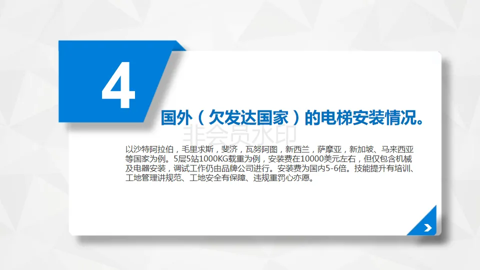 以沙特阿拉伯、毛里求斯、斐济、瓦努阿图、萨摩亚、新加坡、马来西亚等国家为例。5层5站1000KG载重为例,安装费在1万美元左右,但仅包含机械及电气安装,调试工作仍由品牌公司进行。安装费为国内的5-6倍。技能提升有培训、工地管理讲规范、工地安全有保障、违规重罚心亦愿。