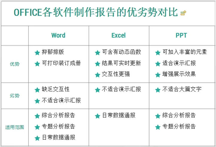 对于大多数公司而言,这些报告主要通过微软的word、Excel和PPT来表现,它们各有优劣势,具体如下图所示: