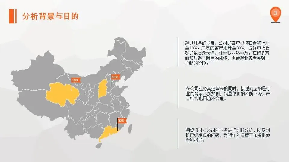 阐述目的主要是为了让读者知道这次分析能带来何种效果,可以解决什么问题。有时将研究背景和目的的意义合二为一。如下图中分析目的就说的很清楚,通过分析企业市场的环境变化以及回答市场拓展中的问题,把握机会推动工作的进展。