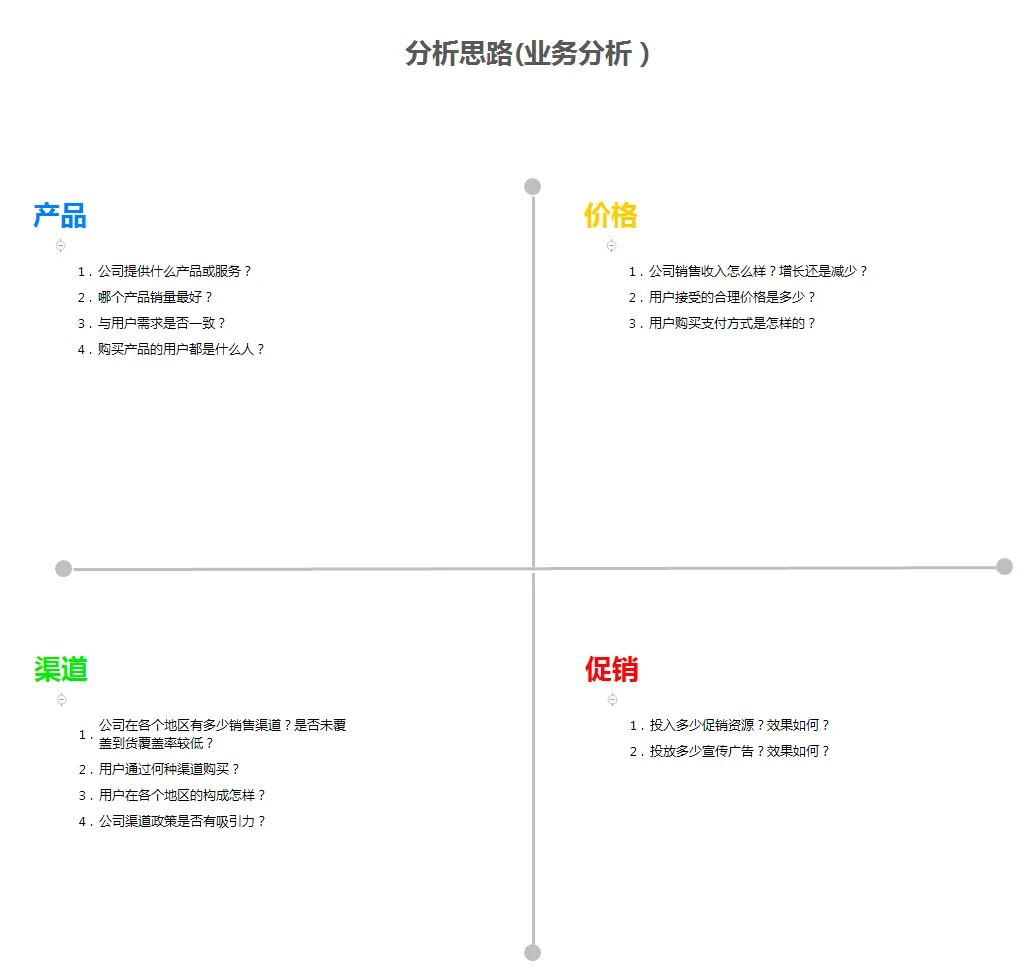 综合分析反映的对象,无论是一个地区、一个部门还是一个单位,都必须以这个地区、部门或者单位为分析总体,站在全局高度反映总体特征,做出总体评价。例如在分析一个公司的整体运营时,可以从常用的4P分析法,从产品、价格、渠道和促销这四个角度进行分析。