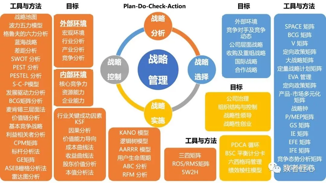 上图我们从目标、工具与方法,战略管理的 PDCA 四要素环节来分析,系统整理了战略管理的框架与方法论,常用的分析工具,一些分析方法在很多场景下也很常用,基于传统企业和互联网企业不同的战略模式,上述工具和方法都在不断更新完善。