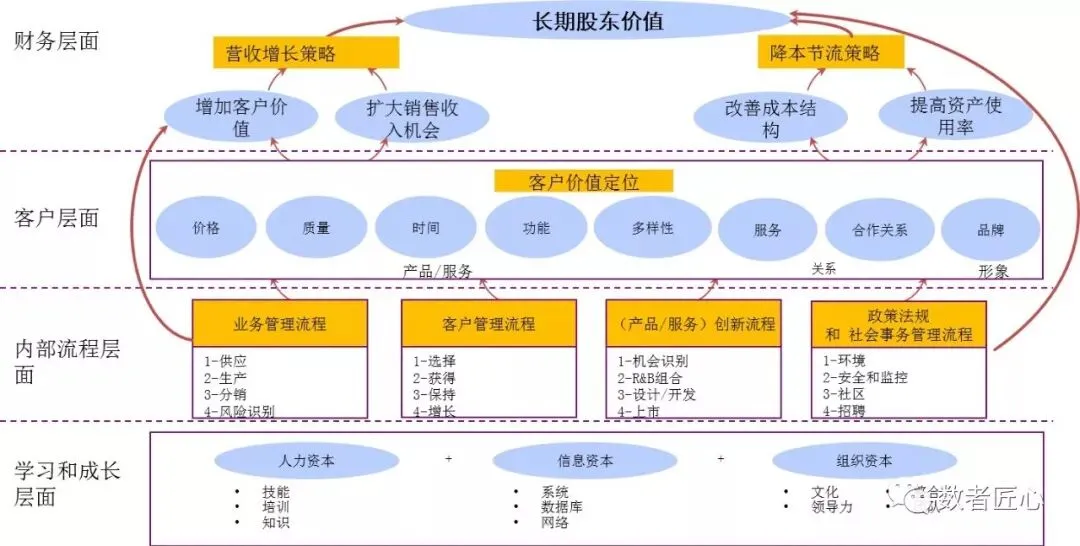 针对传统业务,我们可以选择基于平衡计分卡的战略地图。卡普兰核心的书籍有三本《战略地图》,《平衡记分卡》,《战略中心型组织》,有关如何绘制战略地图请参照第三部著作《战略地图——化无形资产为有形成果》等相关书籍。我们先了解下战略地图的整体概貌。