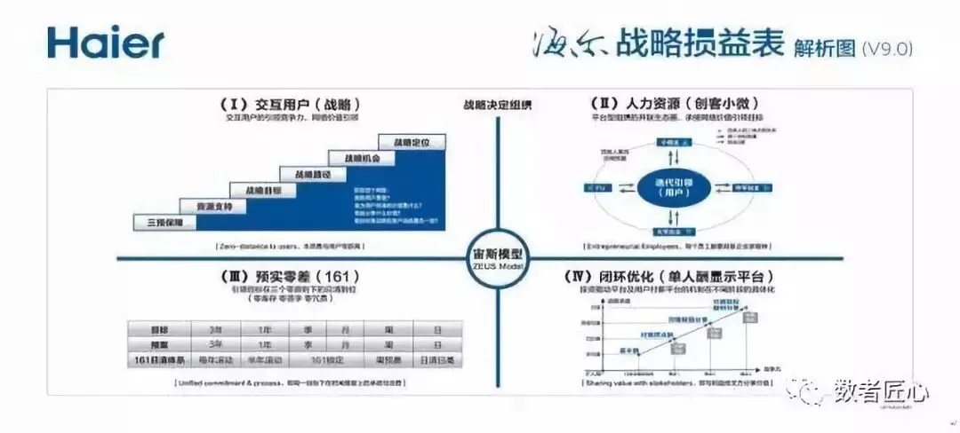 海尔公司的宙斯模型。这个模型的特色是,其并非从财务出发来进行战略布局,而是首先关注用户。因为,互联网时代的特点是“用户即财务”,用户就是企业的财务数据,代表盈利空间,代表估值。极端的情况下,一些并不拥有实际资产的项目,仅仅依靠用户数,也可以获得市场的认可。没有与用户之间的交互,在平衡积分卡上定位出来的产品可能是错误的。