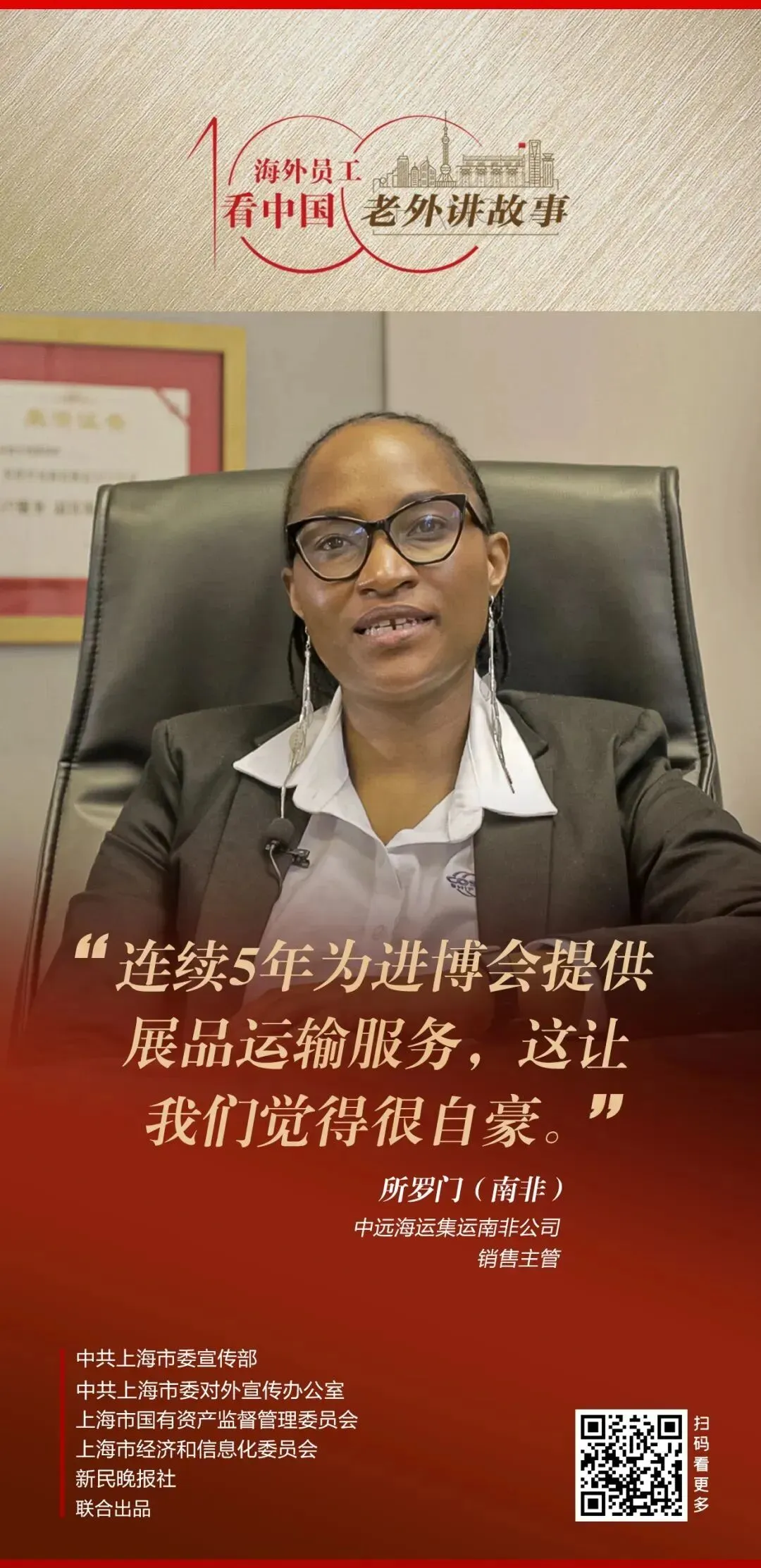 由中共上海市委宣传部、中共上海市委对外宣传办公室、上海市国有资产监督管理委员会、上海市经济和信息化委员会、新民晚报社联合出品的《老外讲故事·海外员工看中国》百集融媒体产品最新推出59-62期内容,蔚来欧洲企业传播总监弗洛安·奥托、中远海运集运南非公司销售主管所罗门、新西兰银蕨农场首席执行官西蒙·林墨、AHAVA国际业务首席执行官麦荣恩讲述自己身处中国企业、观察中国的真实感受。详见↓