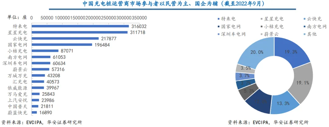 国内充电桩市场发展经历多个阶段,在经历早期资本疯狂入局——市场渗透率迅速提升竞争加剧——充电桩国标发布——市场出清龙头逐渐定型后,当前充电桩市场逐渐迈入稳定运营的新阶段,形成以民营企业平台商为主、国企运营为辅的局面。截至2022年9月,特来电、星星充电、云快充、国家电网四家运营商贡献63.7%的市场份额。