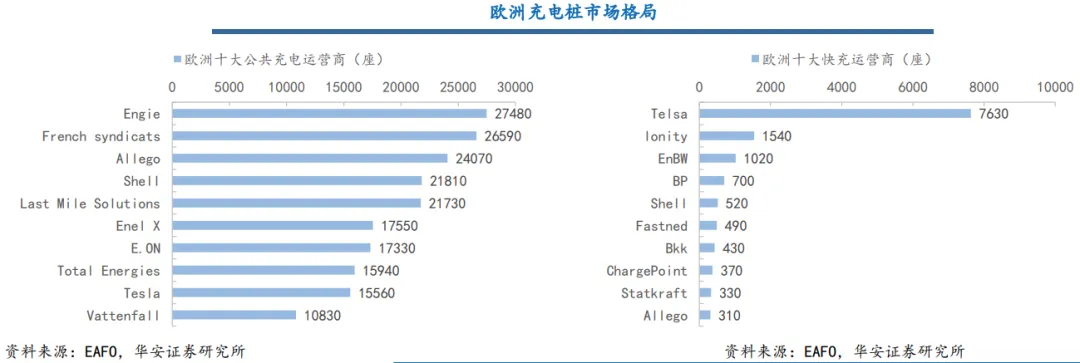 目前欧洲充电市场主要由运营商把控,以Engie、French Syndicats、Allego等为主;设备商则以老牌ABB等为主;快充市场则由车企或能源企业带头推动,如Tesla、Ionity、EnBW、BP等。