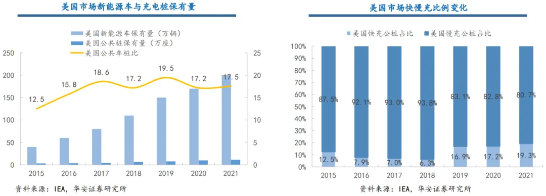 美国公共车桩比例与欧洲市场类似,但以特斯拉为首的头部新能源车企加快新能源车与桩端市场建设,美国市场车桩比稳中有降。据IEA统计,截至2021年美国新能源车保有量为200万辆,公共充电桩保有量为11.4万座(充电站3.6万座),公共车桩比达17:1 ;慢充占比略低于欧洲市场,占比约为81%。