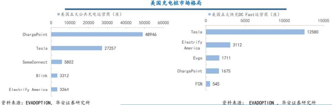 美国为全球第三大的电动车市场,但相较于加油站10.9万座的数量,公共充电站数量仅有3.6万座。美国充电桩按类型分为AC慢充(包括L1-充电1小时行驶2~5英里和L2-充电1小时行驶10~20英里),和DC快充(充电1小时行驶60英里以上)。目前AC慢充L2占比80%,主要运营商ChargePoint贡献市场份额51.5%;而DC快充占比19%,主要参与者以特斯拉为首,市占率达到58%。