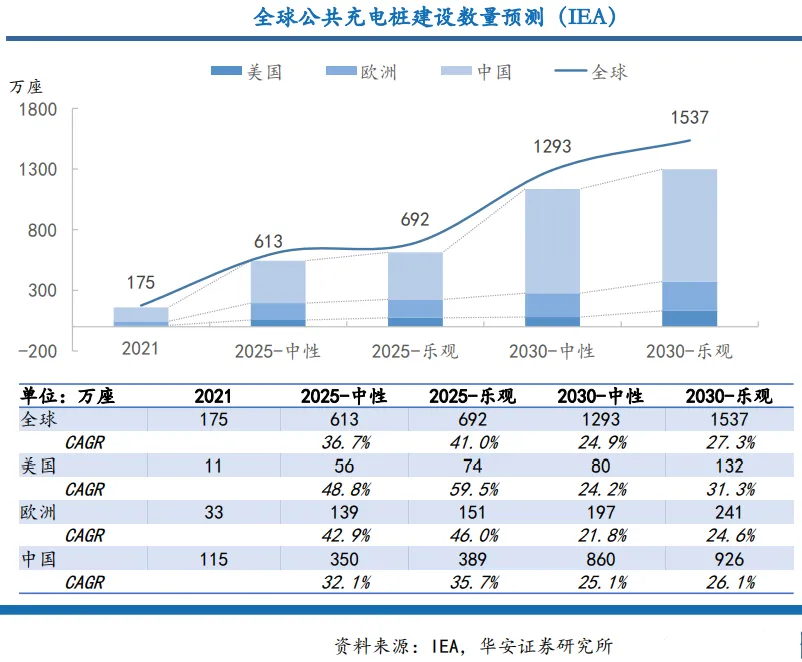 据IEA测算,全球充电桩市场在中国、欧美、东南亚等国家或地区加快建设的背景下,乐观预计在2025年建设完成公共充电桩692万座(包括快充桩213万座与慢充桩480万座),预计在2030年建设完成公共充电桩1537万座(包括快充桩542万座与慢充桩995万座)。