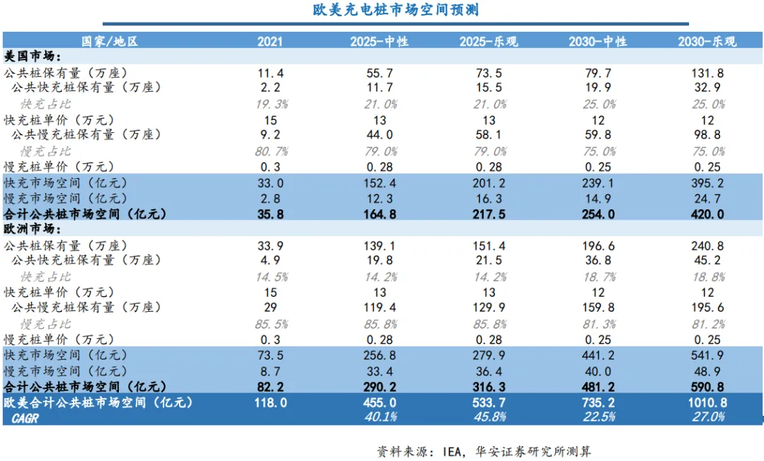 基于IEA对欧美充电桩建设数量的预测,我们假设欧美市场快充桩单价为12-15万元,慢充桩单价2500-3000元,乐观预计至2025年欧美公共充电桩市场为534亿元,复合增速为45.8%;预计至2030年欧美充电桩市场规模为1011亿元,市场空间较大。