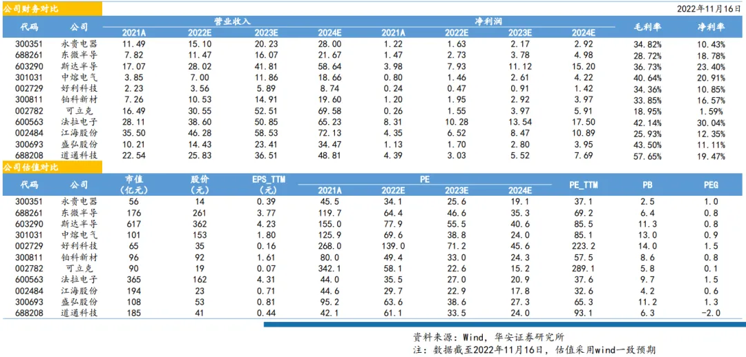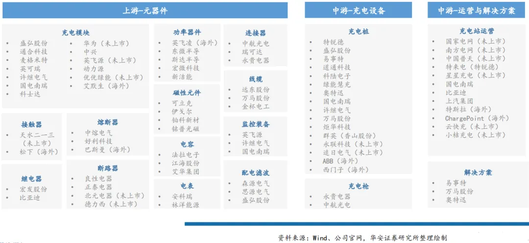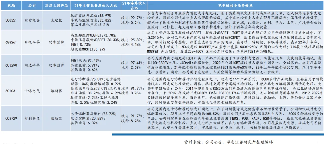 充电枪(永贵电器),功率器件(东微半导、斯达半导、宏微科技、新洁能),熔断器(中熔电气、好利科技),磁性元件(铂科新材、可立克、伊戈尔),电容(法拉电子、江海股份、艾华集团),连接器(瑞可达、永贵电器),继电器(宏发股份),充电模块(盛弘股份、道通科技、英可瑞、通合科技)等。