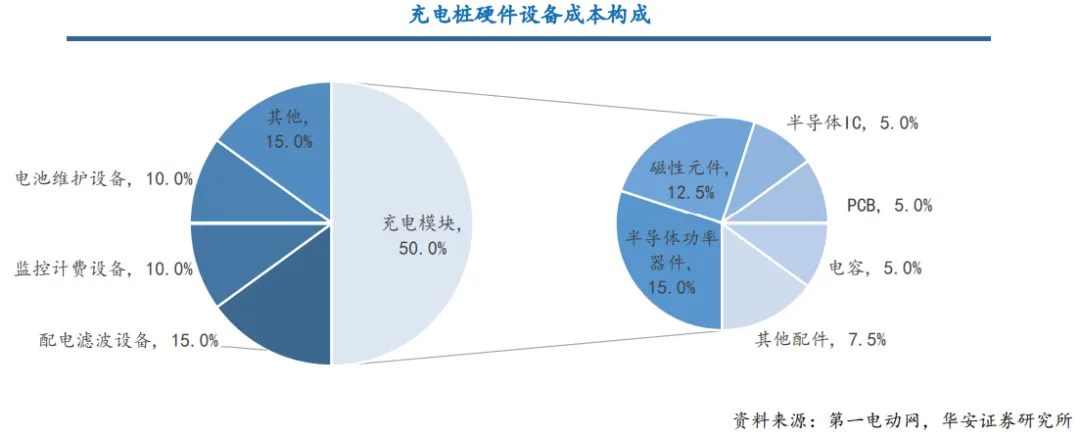 充电桩硬件设备构成包括充电模块、配电滤波设备、监控计费设备、电池维护设备等,充电模块占比最高50%。而充电模块成本构成包括功率器件(30%)、磁性元件(25%)、半导体IC(10%)、电容(10%)、PCB(10%)等。