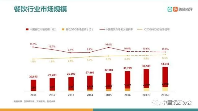 从红色柱子来看中国餐饮消费额从2011年到现在,在不到8年的时间内从过去的2万亿增长到年底达到4万亿(预估),中国餐饮市场增长是非常快的,这个行业还是欣欣向荣、发展迅速。
