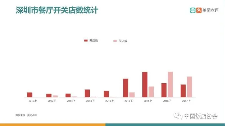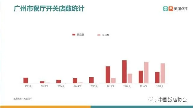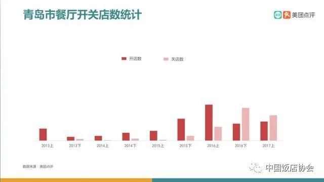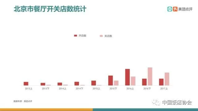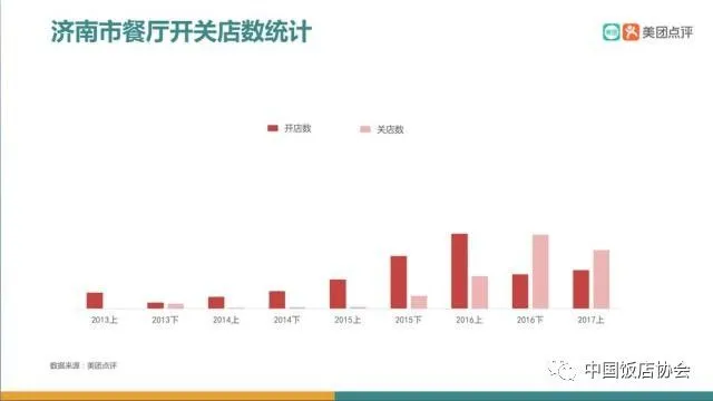 非餐饮行业的投资人进入到这个市场像通过互联网创新的方法,重新迭代这个行业,从右侧粉色柱子可以看到关键的数量,比如说2016年开店数和关店数合起来看全年非常的高。虽然能这个数据不能代替整个行业,但可以看到趋势如此。从2016到2017年来看的话,都是以百万级的数字在更新和迭代,上百万家甚至几百万家的企业在开新店,也有企业在关店,这是这个行业的变化。具体到这个几个城市来看跟大盘的走势差不多。