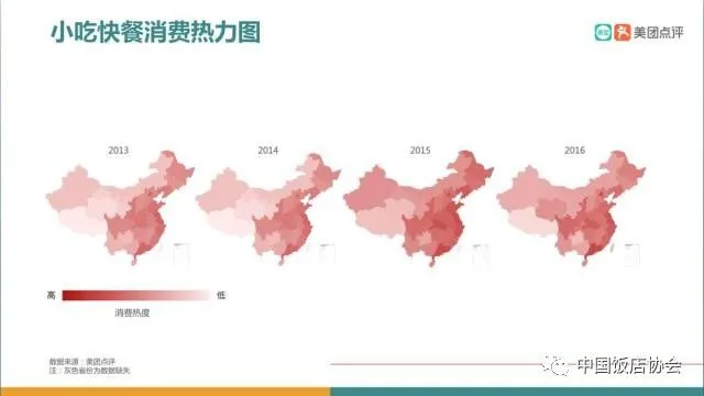 小吃快餐类品类2015到2016两年颜色在稍微变浅,表现出这个品类随着人们对消费水平的提高变得没有那么火热了,过去一碗拉面就解决吃饭问题,现在大家对于吃的要求提高了,要吃饱更要吃好。