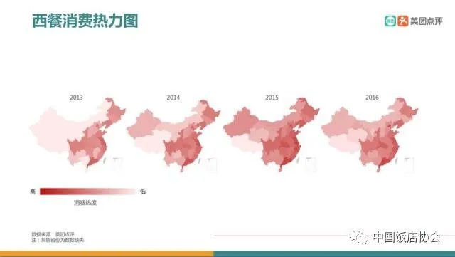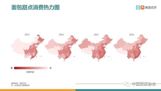 面包甜点与西餐,一个辅食一个正餐,这两个品类与区域经济的发展状况有很大关联,经济状况越高,受欢迎度越高。基本上东南沿海发达地区这个品类的热力比较高一些,而在中西部地区,尤其是到大西北它的发展就相对慢一些大。