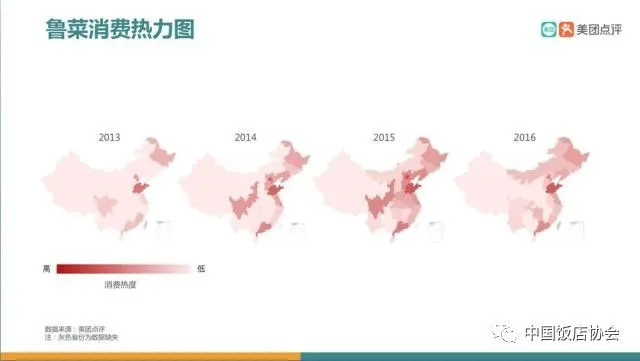 中国四大菜系中鲁菜可谓磕磕绊绊,除了2014、2015年发展不错,比如说四川区域也都有鲁菜的开店热潮,但到2016年又退守到2014年形势,从数据来看除了广州这个大吃省份外,其他的省份鲁菜的发展任重而道远。