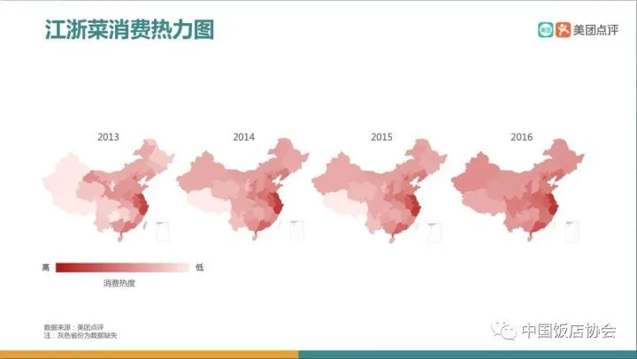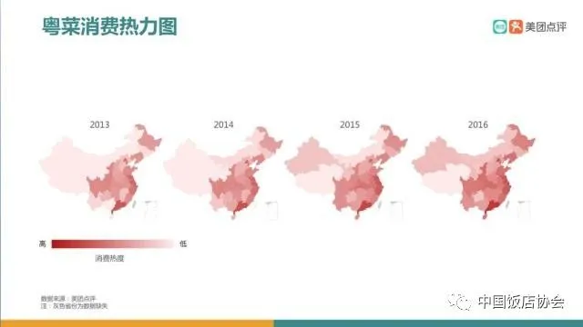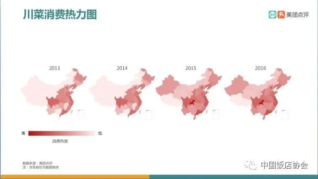 川菜可谓是一辣火天下,基本上从2013、2014年开始从四川省、重庆市这样的地方向全国扩展,2015、2016年扩展到大西北包括大东北,不少的店面做迅速的扩张。江浙菜以及粤菜发展状态也不错,这两种菜系口味稍偏清淡一些,这也反映人们消费口味的变化。