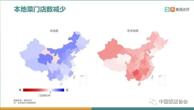 本地菜与非本地菜,像本地企业开本地菜的这个数量我们用蓝色来表示,所以从左边来看,除了甘肃、宁夏中间稍微偏白或者分色的这一块之外,其他的基本上是蓝海,就是说我们的本地菜才本地已经淡化了或者开店热情没那么高了。但是从非本地菜的角度看(右侧红色),他的开店速度非常快,像贵州省这一点是非常明显的。