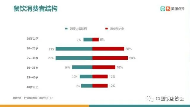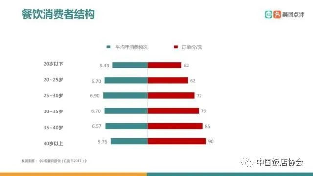 从年龄比例来看,我们认为从20到30岁,这个阶段消费的人均比例最高,是消费贡献最高且人数最多的主力消费人群。20岁以下是学生,因没有收入不做具体分析。20岁-40岁年消费频次是逐渐递减,年龄越大外出吃饭的机会就越少,但是客单价是随着年龄的增加在增加,消费增强吃的花费就越高。