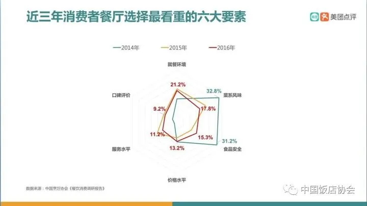在近三年消费者餐厅选择最看重的六大要素方面,2014年以菜系及食品安全是最看重的,到2015年及2016年越来越接近于圆心,表明消费者对餐厅的要求开始变为多元化,到2016年这个趋势可以看的比较明显了,将近21.2%的消费者追求就餐环境,同时对菜系口味的关注度占17.8%。并不像2014年单项突出即可得到消费者的关注。