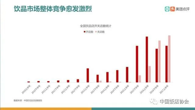 饮品在近两年发展非常火爆,从2015年上半年直到今年上半年这条红色的陡然上升可以看出饮品的热度之大,大批餐饮企业或非餐饮业投资人进入到这个行业,他们提供咖啡、茶这样的饮品服务,右边的浅色柱子可以看到存续是很少的,餐饮这个行业不可能一蹴而就,所以这些新兴企业快的起来走的也快,可以看到从去年下半年到今年上半年关店数量已经超过了开店的数量。