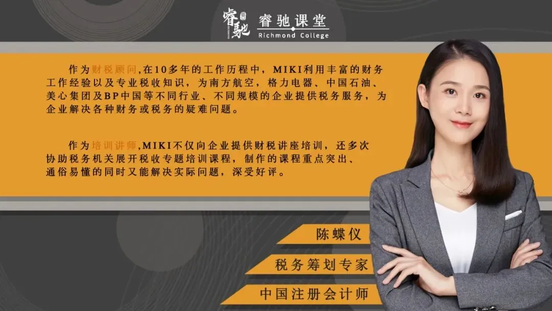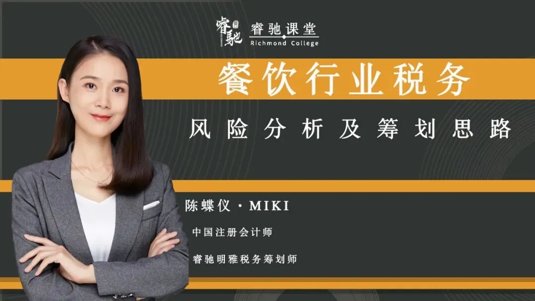 陈蝶仪 MIKI,睿驰明雅高级讲师,中国注册会计师,税务筹划专家。Miki授课善于将企业情况切入视角,紧扣企业发展核心需求。制作的课程严谨专业,举例形象生动,将餐饮行业中的税务风险案例复杂理论简单化,深受学员的好评与喜爱。