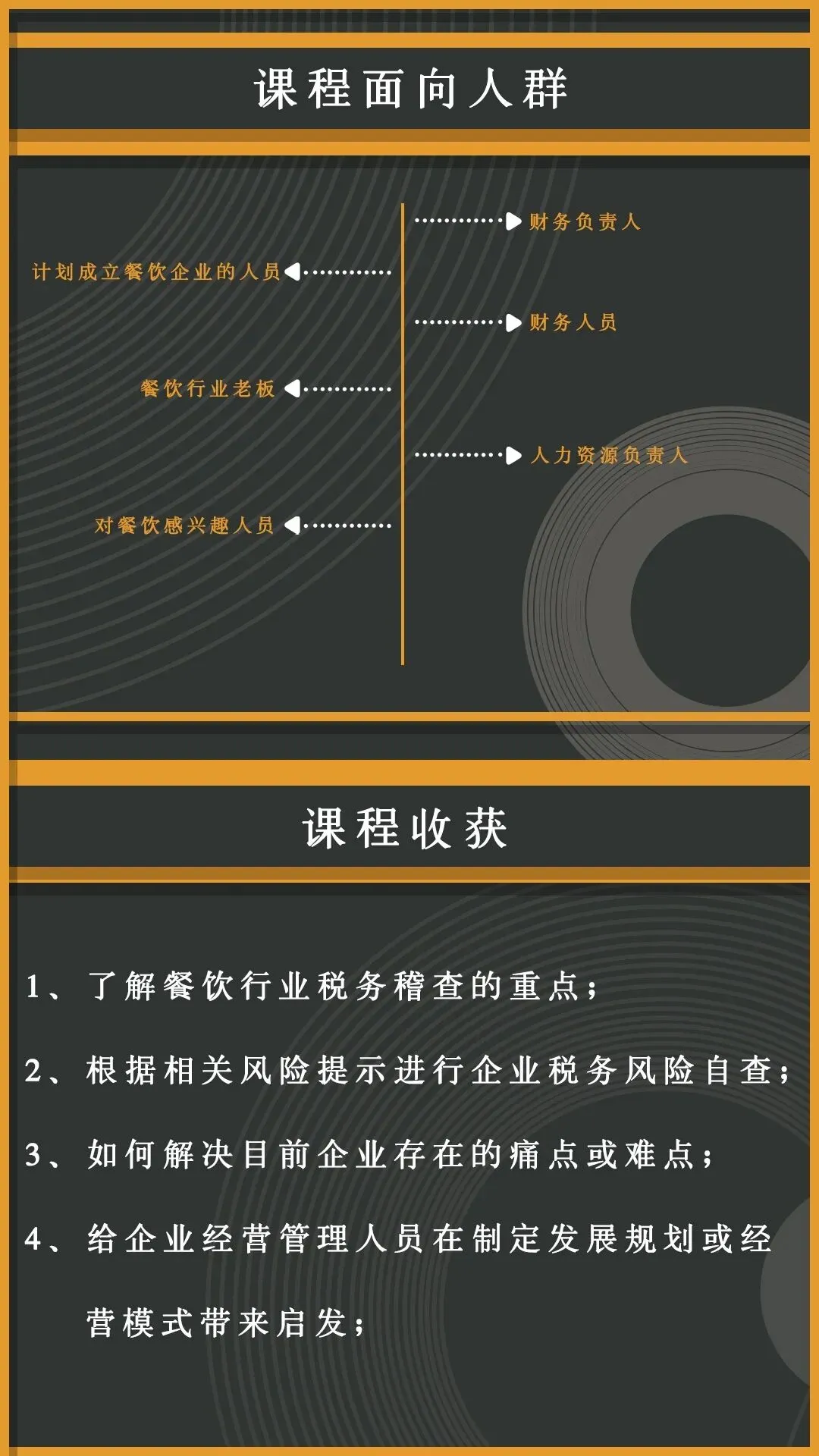 本课程以增值税、企业所得税、个人所得税印花税四个常见税种为主,结合餐饮行业特色业务,详细分析餐饮行业中常见的涉税风险,并通过分析餐饮行业存在的痛点或难点,提出解决方案的思路或技巧。不仅使学员了解餐饮行业常见的风险问题,而且提高学员税收风险意识,多维度启发经营管理人员及财务管理人员的企业管理及税务筹划思维。