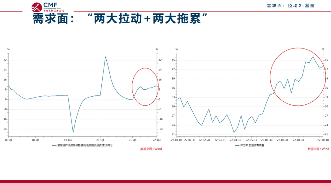 两大拉动力量之一是出口。1-9月,以美元计出口同比增速为12.5%,显示出较强的韧性。拉动力量之二是基建。今年以来基建投资增速整体维持在一个较高的水平,而三季度基建的表现更是尤为突出,这其中一个关键因素是前端的开工在加快转化为中后期的实物工作量。我们可以用沥青开工率周度高频数据作为实物工作量的观察指标,下图展示的是今年以来沥青开工率周度变化,圈出来的这块是三季度以来的表现。三季度以来,沥青开工率大幅提升,意味着前端开工在加快转化为周中后期的实物工作量。三季度基建为什么好?这个问题等价于三季度究竟解决了基建前期的哪些问题?我们把前期的问题归结为“三无/三没有问题”——没资金、没法干、没动力。针对“没资金”的问题,中央投放了6000亿政策性开发金融工具,同时地方5000亿专项债限额被盘活,这其中很多资金都是在三季度集中发放的。“没法干”主要是指防疫政策限制和前期高温限电政策导致无法开工,这些因素在三季度也是大幅消退。“没动力”主要是指地方政府前期可能出于预期不稳等各种原因处于观望状态,对此,三季度开始国务院督导组直接下到地方,同时7月份的政治局会议直接点名“经济大省要勇挑大梁”,再叠加中国地方政府之间的“锦标赛机制”,一下子就把地方政府的动力问题给解决了。